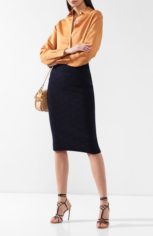 Товар можно купить по цене 54 400 руб. c доставкой на сайте , доступные размеры уточняйте на сайте магазина. В весенне-летнюю коллекцию 2019 года Наташа Рамсей-Леви включила темно-синюю юбку-карандаш из мягкого шерстяного трикотажа. Модель универсального цвета не выглядит просто. Все дело в золотистом жаккардовом барочном узоре в виде заглавной буквы названия бренда и широком эластичном поясе, напоминающим корсет. Эта деталь, сложенная пополам, адаптирует вещь для делового образа. Модель представляет из себя: CHC19SMJ62520. Цвет Темно-синий. Материал Шерсть: 81%; Металлизированное волокно: 3%; Вискоза: 3%; Полиамид: 13%;.